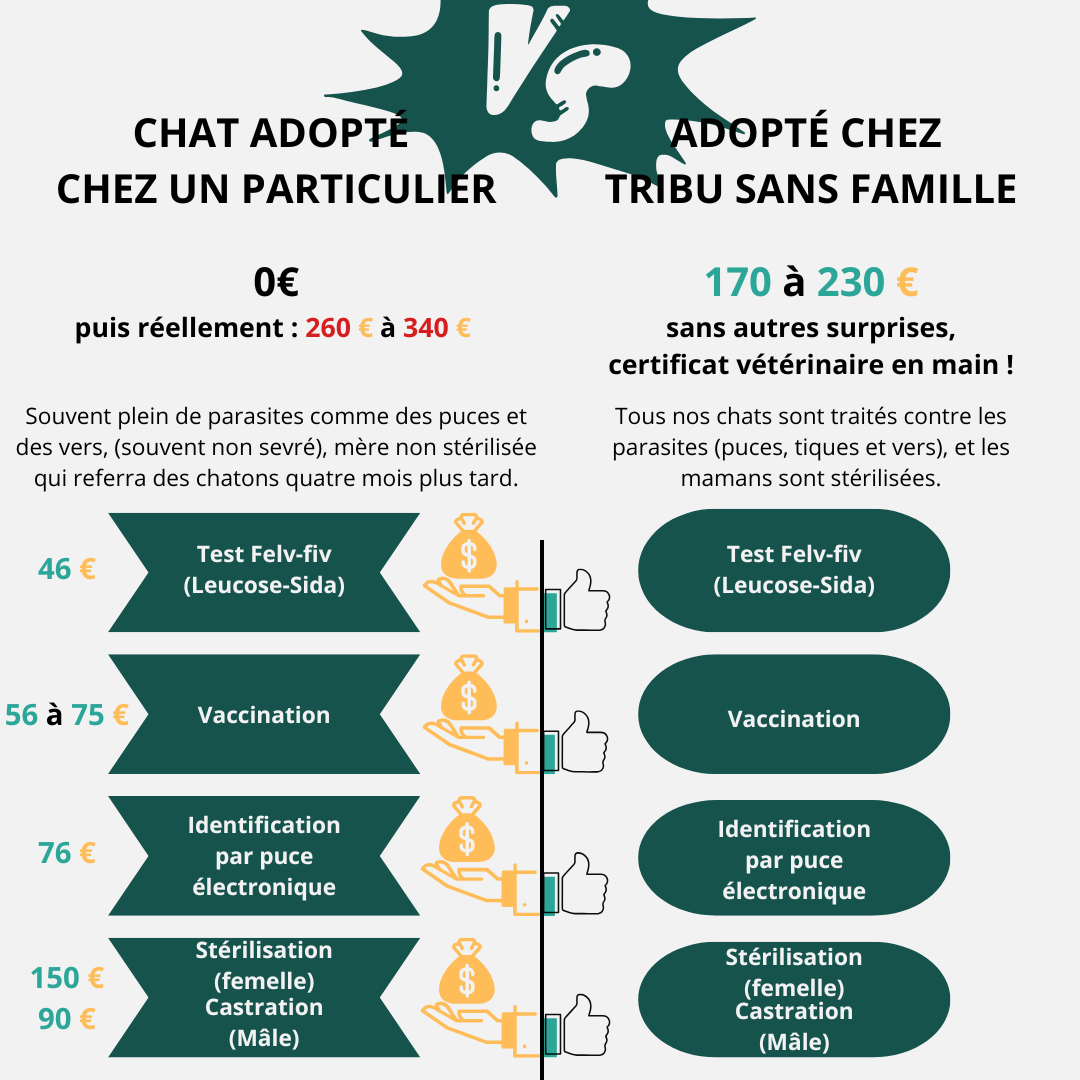 En adoptant chez Tribu sans famille, les chats sont soignés et sociabilisés. Vous n'avez pas de surprises concernant une quelconque pathologie ou concernant le caractère des chats. Toutes les informations vous sont données en amont. Nos chats sont déparasités (vers, puces et tiques). Les mères sont stérilisées. Vous trouverez ci-dessous les différences entre adopter un chat chez un particulier et adopter un chat chez Tribu Sans Famille.